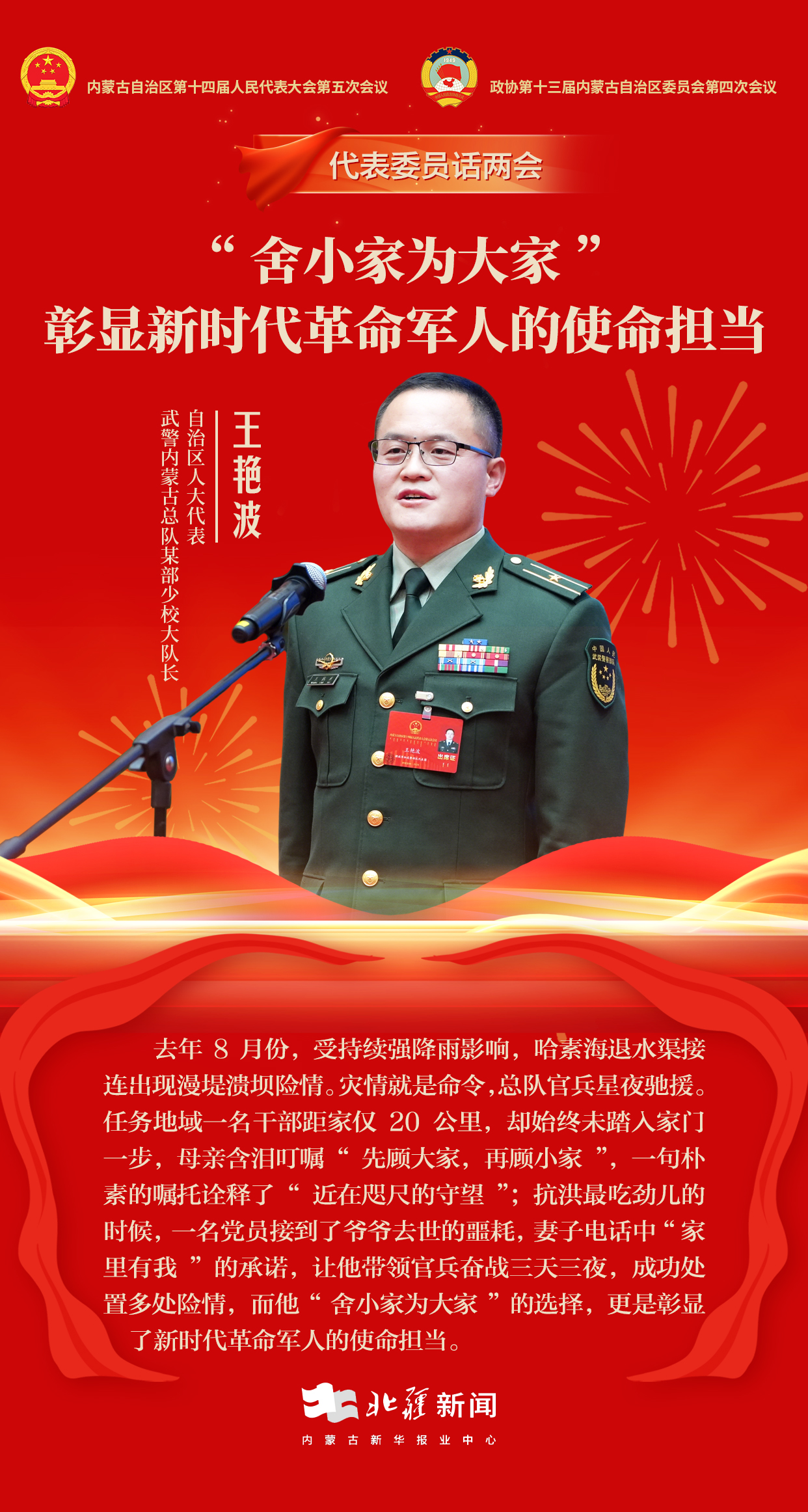 “作为驻守祖国北疆的武警官兵,我们心中既有练兵备战的热血记忆,更有军民同心的温暖感动。”2月4日,内蒙古自治区第十四届人民代表大会第五次会议“代表通道”上,自治区人大代表、武警内蒙古总队某部少校大队长王艳波,分享了北疆卫士练兵备战、守护平安、军民同心的难忘经历与使命担当。