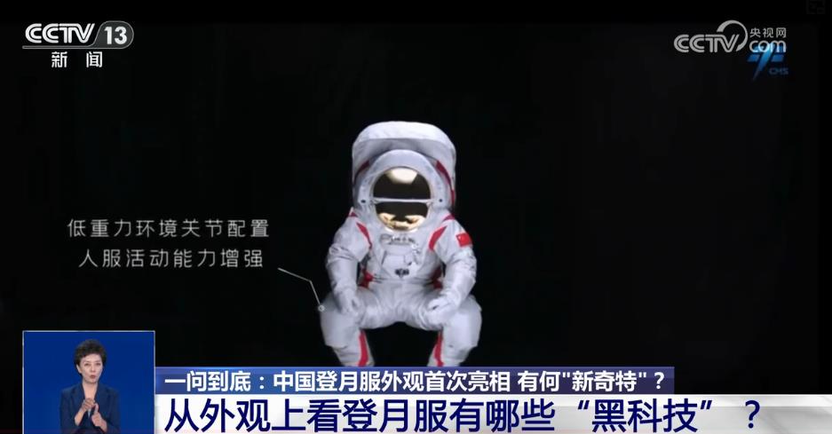 登月服拥有综合防护面料,可有效防护月面热环境及月尘影响。面罩是全景式防眩光面窗,提升视觉工效。头部两侧位置还分别配置了一个长短焦距摄像机,可实现远近景视频摄录。胸前有多功能集成控制台,操作更便捷高效。整体轻量化,适应月面活动需求,低重力环境关节配置,人服活动能力增强。也就是说,可蹲可弯腰,科技感十足。