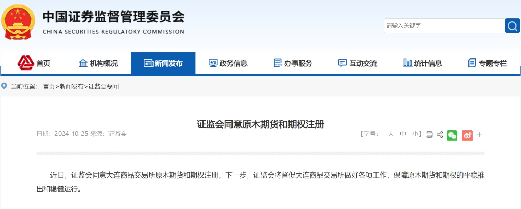 证监会10月25日宣布,近日同意大连商品交易所原木期货和期权注册。