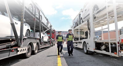 港珠澳大桥海关关员对出口汽车进行监管。俞 波摄