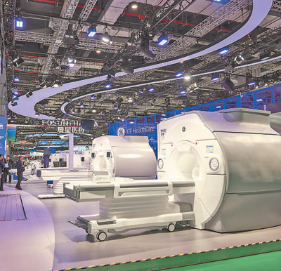 第七届进博会医疗器械及医药保健展区展出的凌云3.0T“读秒成像”磁共振。本报记者 伊 霄摄
