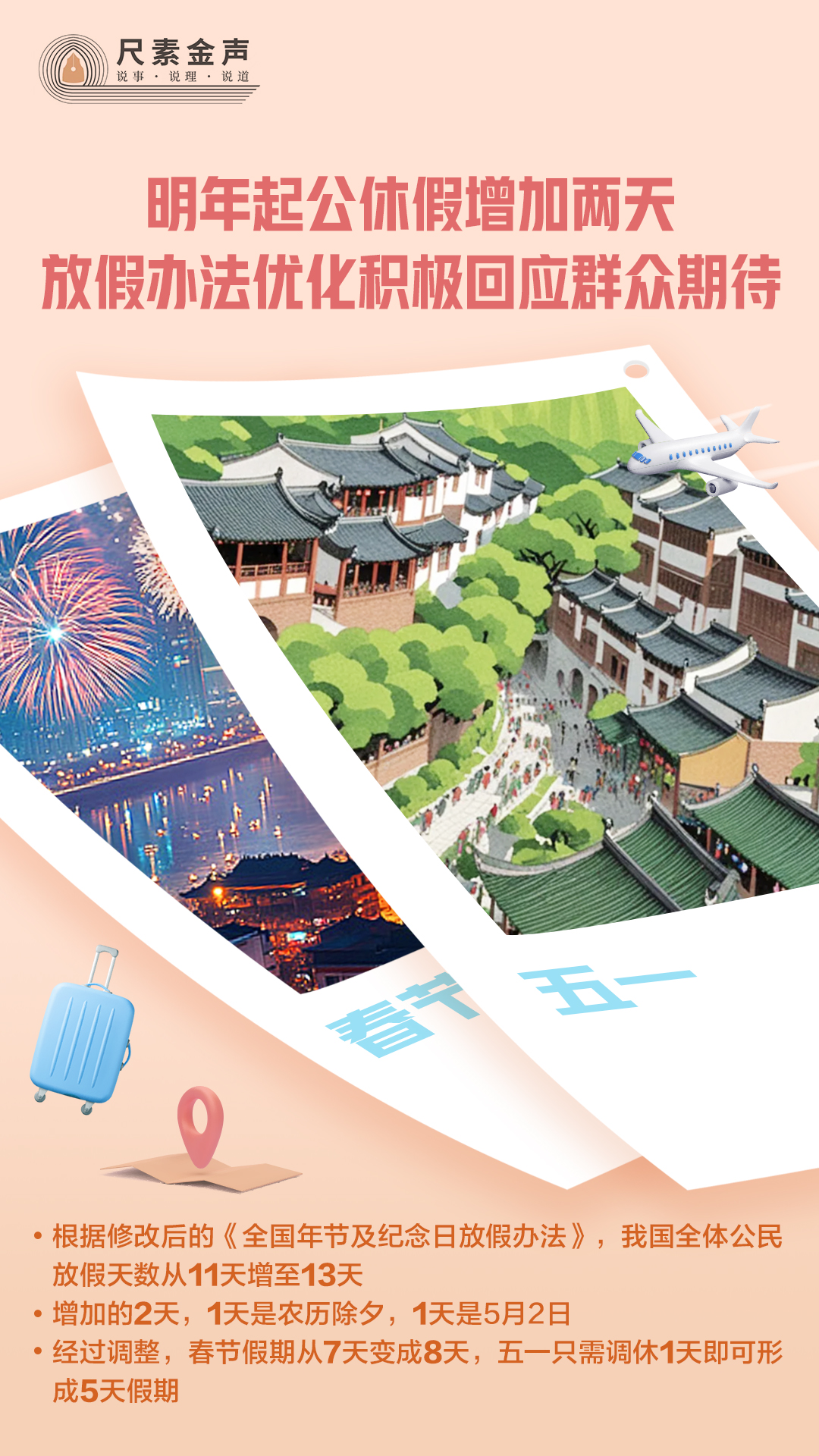 近日,国务院公布《关于修改<全国年节及纪念日放假办法>的决定》,并公布2025年部分节假日安排。“每年多放两天假”“抓紧买好机票准备出游”……消息刚一发布,便受广泛关注。