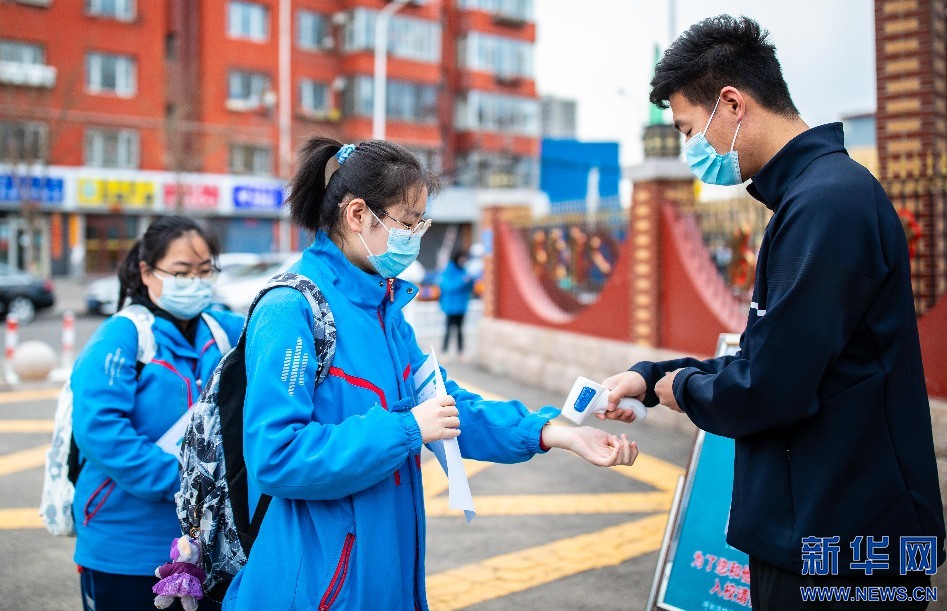 4月1日,内蒙古自治区呼和浩特市第六中学高三年级学生入校前接受体温检测。新华网发(丁根厚 摄)