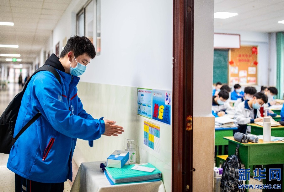 4月1日,内蒙古自治区呼和浩特市第六中学高三年级学生在班级防疫角清洁手部。新华网发(丁根厚 摄)