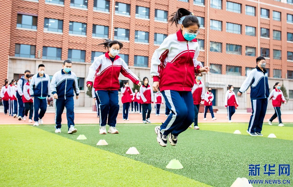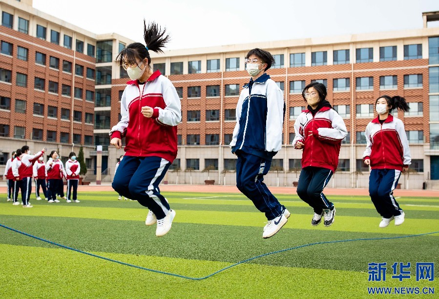 4月1日,内蒙古自治区呼和浩特市第六中学高三年级学生在体育课上跳绳。新华网发(丁根厚 摄)