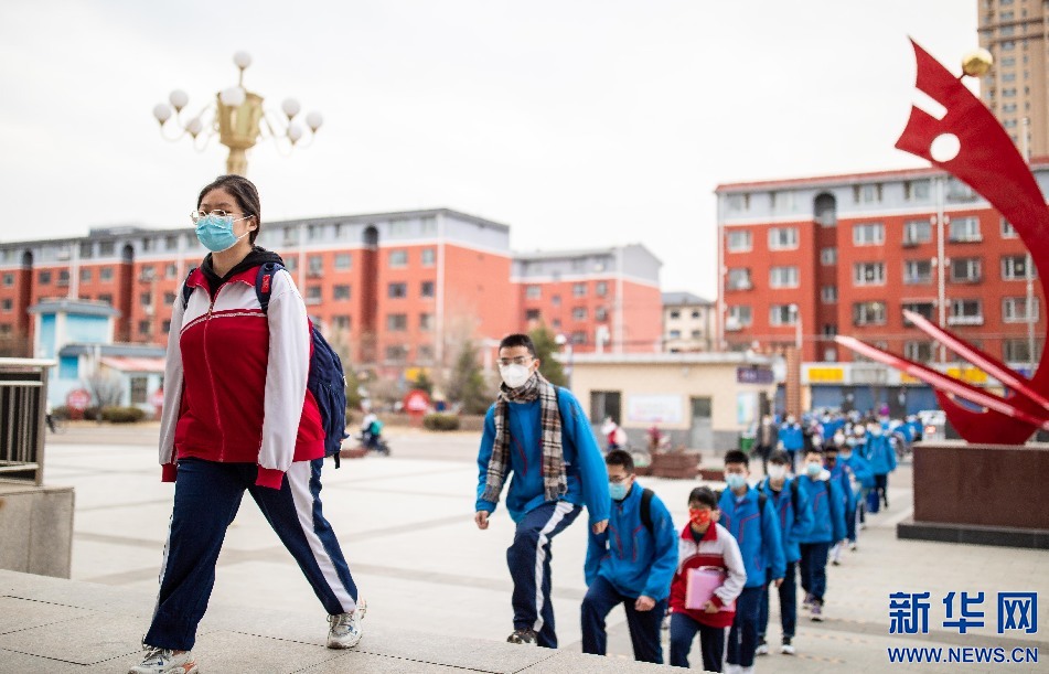 4月1日,内蒙古自治区呼和浩特市第六中学高三年级学生排队进入校园。新华网发(丁根厚 摄)