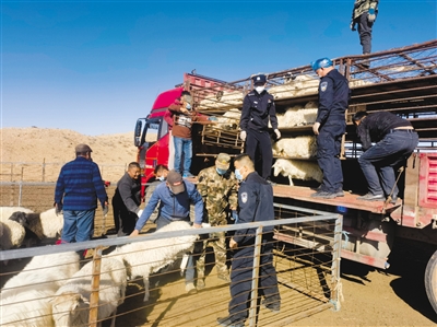 派出所民警帮助牧民将400多只羊装上汽车。