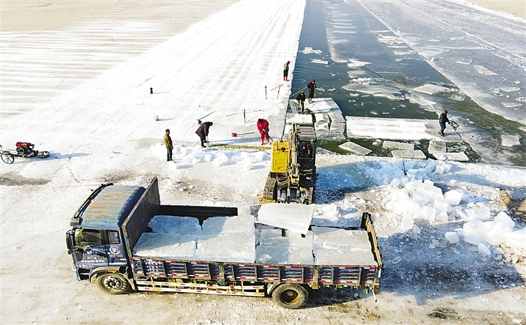 1月5日,采冰人在呼和浩特大黑河结冰的河面上作业,将冰块切割运输到大黑河军事公园,为“2023呼和浩特冰雪节”做准备。内蒙古日报社融媒体记者 王磊 摄