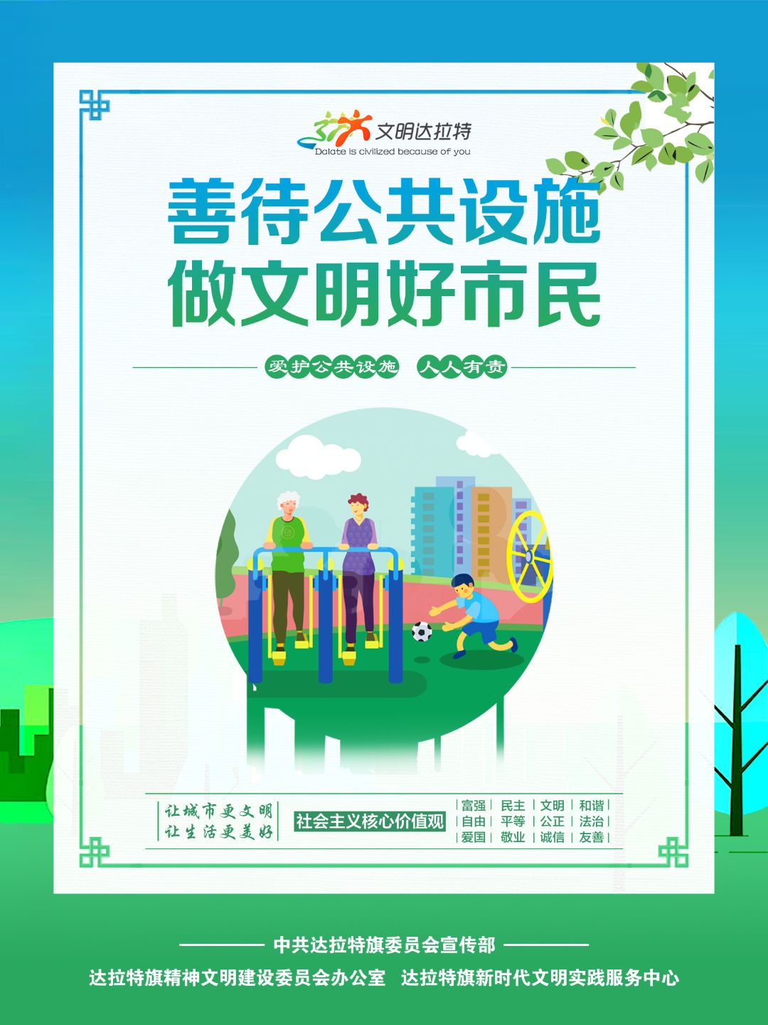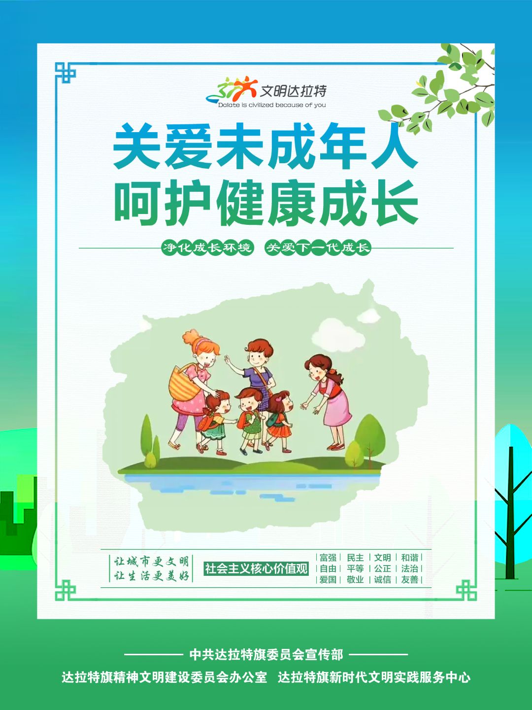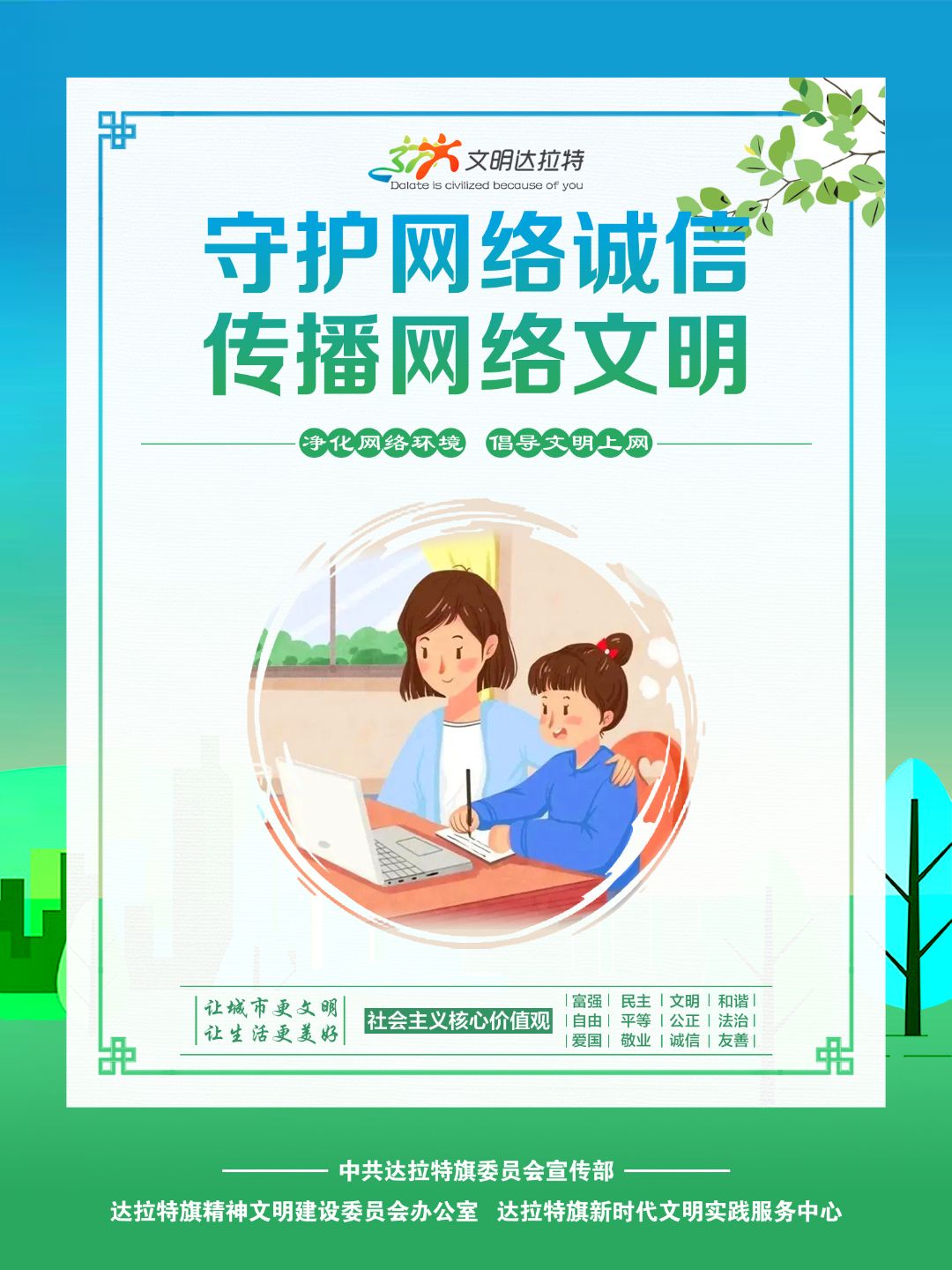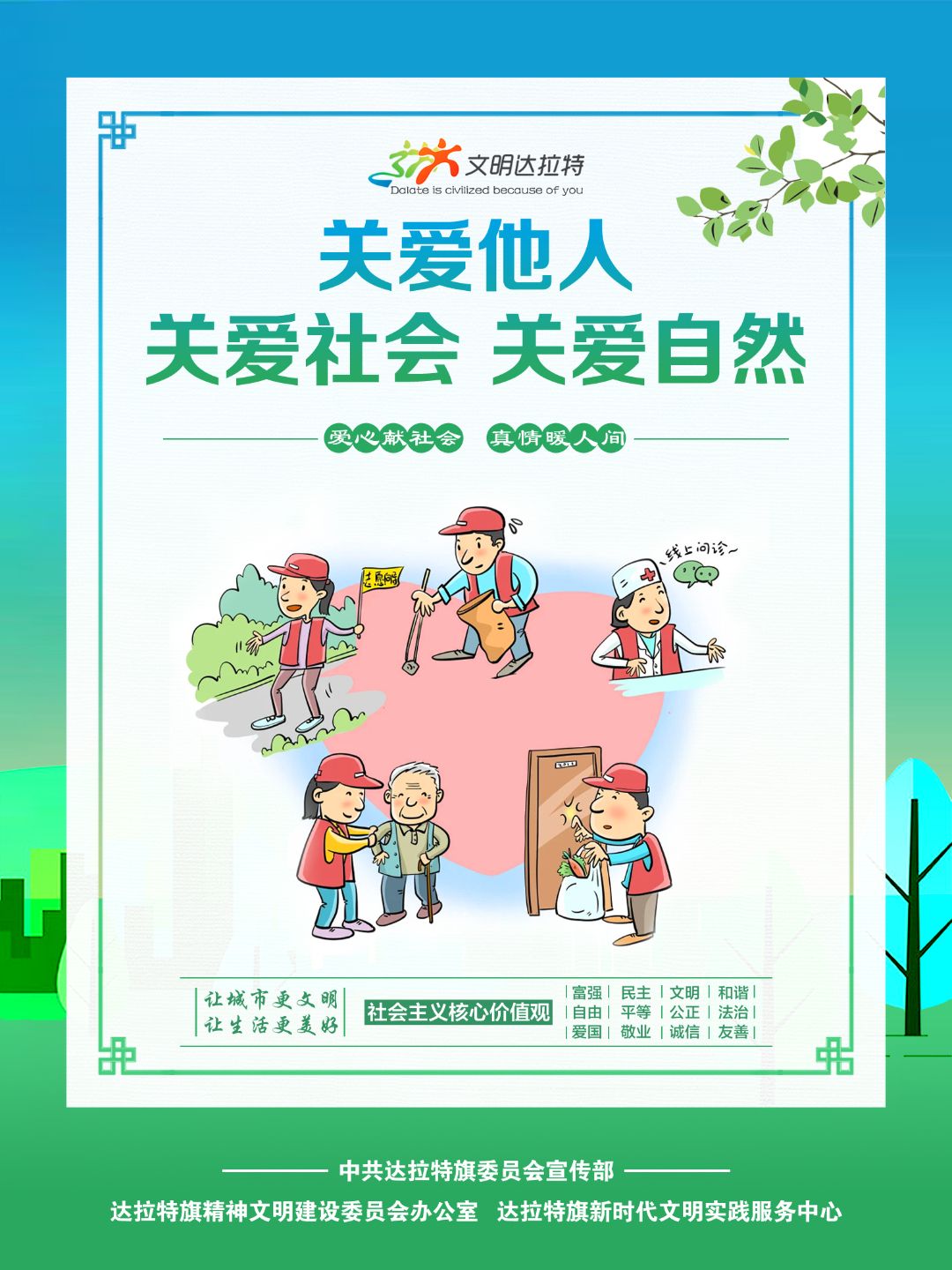 近年来,内蒙古自治区各盟市、旗县(市、区)设计制作了一批具有很强表现力、感染力、传播力的公益广告作品,用简洁明快、通俗易懂的画面和语言,阐述文明故事,弘扬文明理念,引领时代新风,为统筹推进文明培育、文明实践、文明创建营造了良好的舆论环境。
