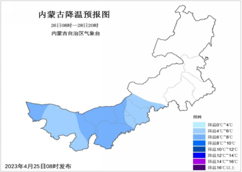 4月26日8时至28日20时,我区中西部气温下降4到6度,西部偏西北和偏东地区气温下降6到8度。