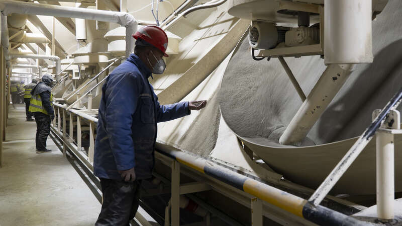 3月27日,在宁城星美科技有限公司的生产车间内,工人正在查看造粒机造出的猫砂颗粒大小。齐学涛/摄