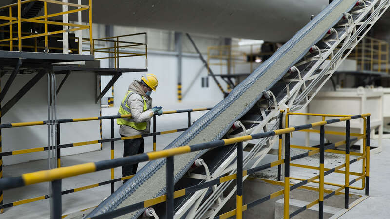 3月27日,在宁城星美科技有限公司的生产车间内,工人正在操作自动传输皮带运输猫砂。齐学涛/摄