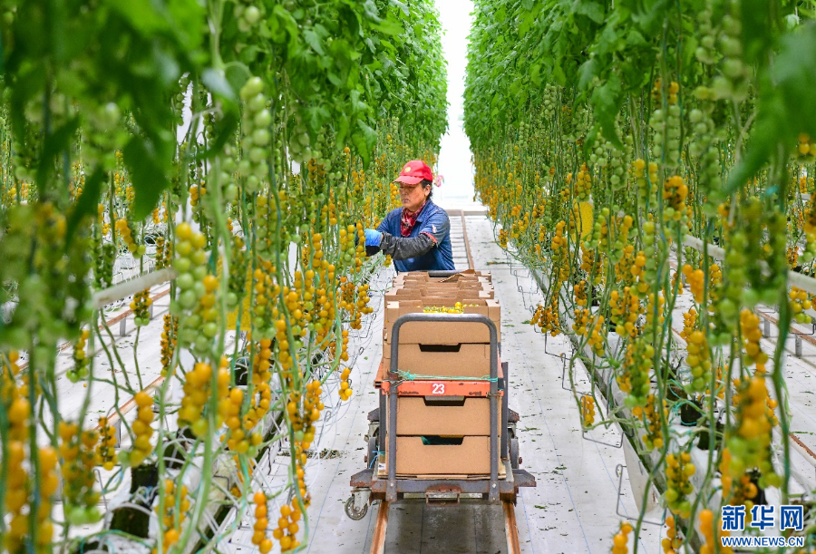 3月22日,工人在乌兰察布宏福农业产业园智能温室里采摘番茄。新华网发(王正 摄)