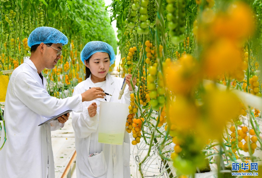 3月22日,科技人员在乌兰察布宏福农业产业园智能温室里观察番茄长势。新华网发(王正 摄)