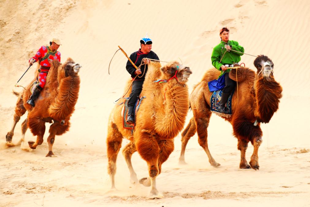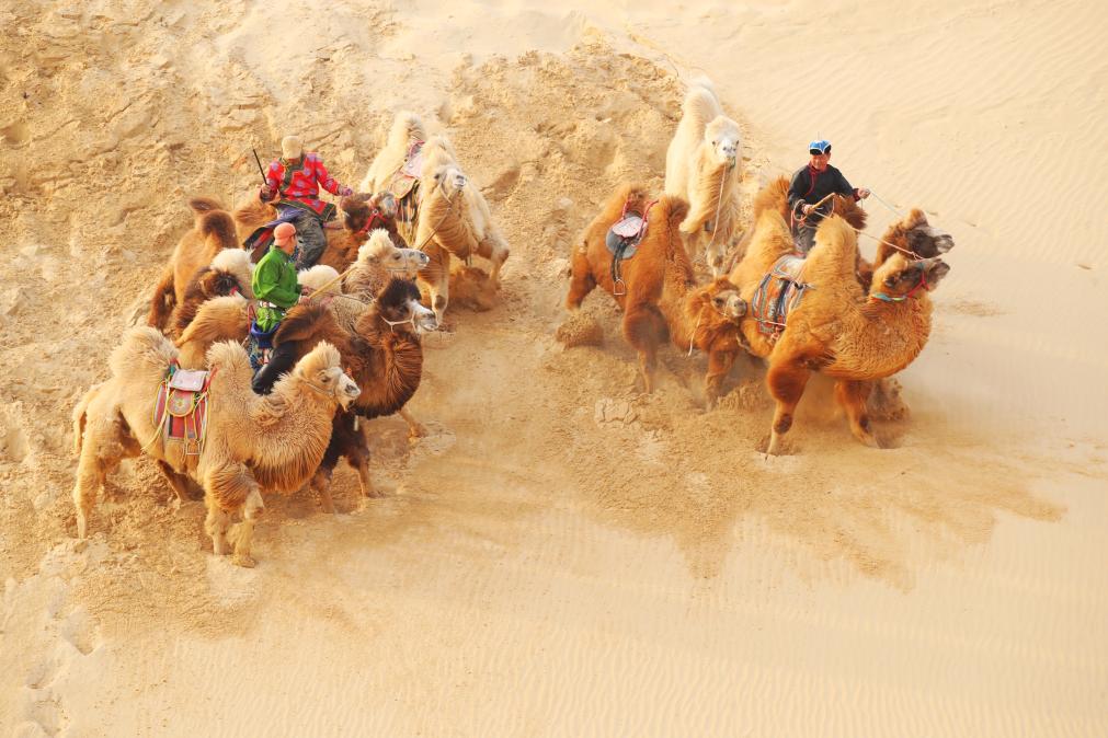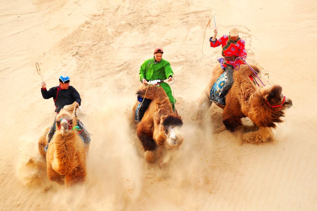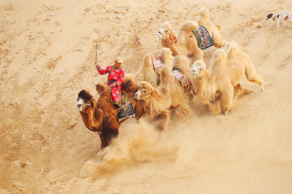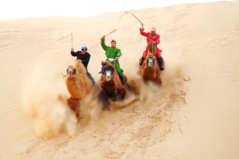 近日,内蒙古通辽市奈曼旗宝古图沙漠旅游区内,雄浑壮阔的群驼冲沙民俗盛会火热上演。当地牧民驾驭双峰驼驰骋连绵沙海,飞沙卷浪、驼影奔涌,在广袤大漠间绘就了一幅兼具野性力量与草原风情的壮美画卷。