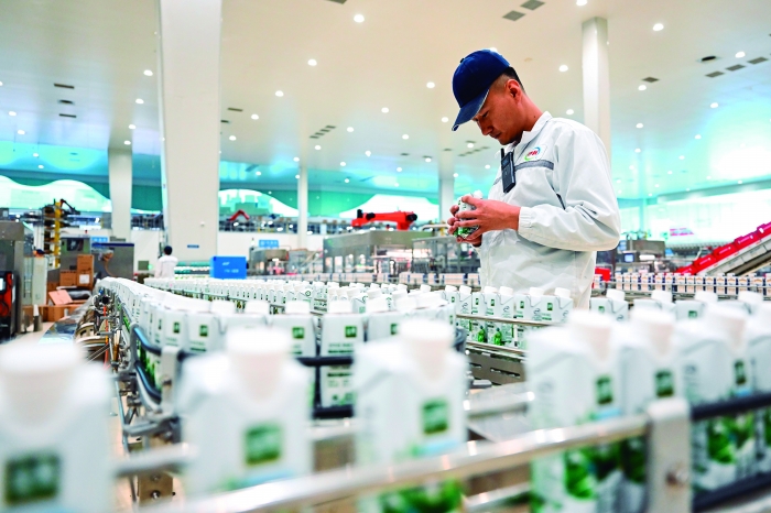 在呼和浩特市伊利现代智慧健康谷液态奶全球智造标杆基地,工人在检查奶制品包装情况。新华社图文