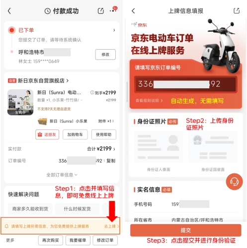 根据新政策,内蒙古公安交管部门将车辆预查验、信息登记、号牌发放等环节嵌入线上购车流程,推动“一市一牌”服务落地。这一举措的核心是电动车牌照实行“属地管理”原则,即车牌的使用范围与登记城市一致,既严格遵循全国统一的技术标准,又能让各地根据本地交通管理需求优化服务细节,让消费者享受更贴合本地实际的便利服务。京东汽车积极响应政策要求和市场需求,让全区电动自行车可通过京东线上渠道享受便民上牌服务。以往消费者购车后需自行前往交管部门办理手续,耗时耗力。如今消费者通过京东APP购买新国标电动车,只需搜索“自营电动车”,选购车辆后在提交订单时按页面提示填写上牌人身份信息,上牌登记流程即可在线上完成,车辆发货前已绑定对应号牌,真正实现“购车即上牌、到手即上路”,极大提升了购车便利性与体验效率。