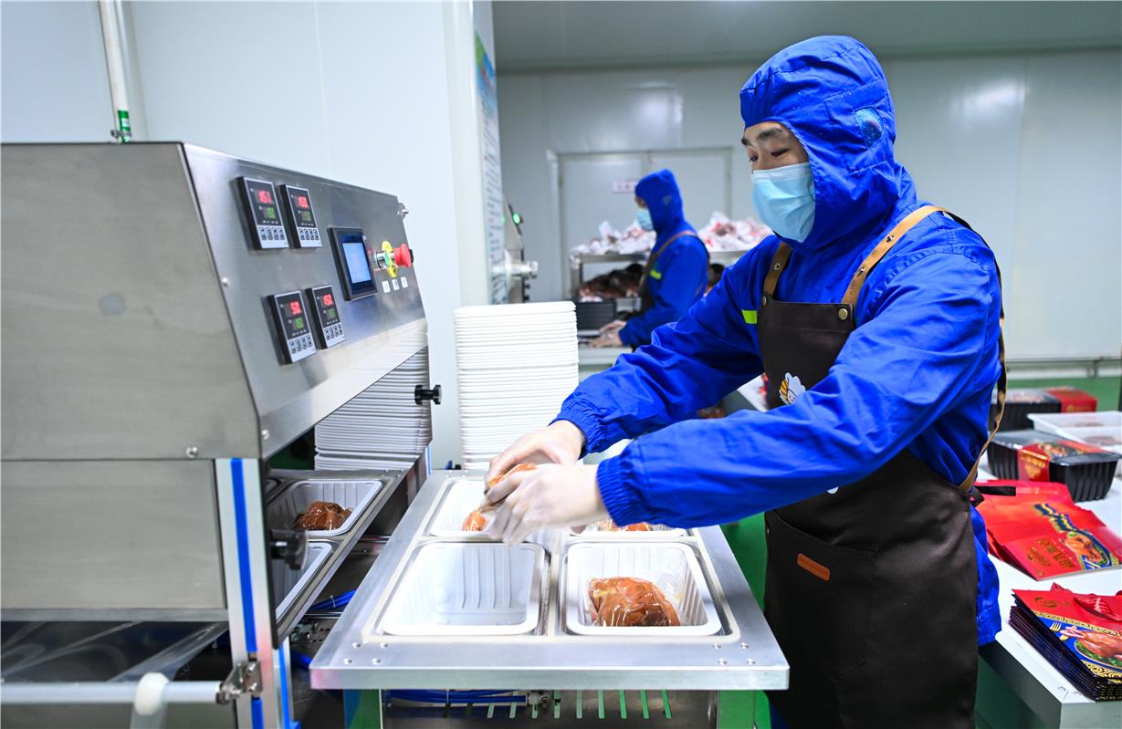 4月6日,在位于赤峰市元宝山区绿色农畜产品加工园区的赤峰中凯食品有限公司生产车间内,工作人员正在打包分装熏鸡。据了解,该公司打造集研发、生产、销售于一体的完整产业链,产品覆盖风干肉、熏鸡、熏肉、风干肠、鸭货五大品类,年生产量达2000吨,畅销全国二十余个地区。