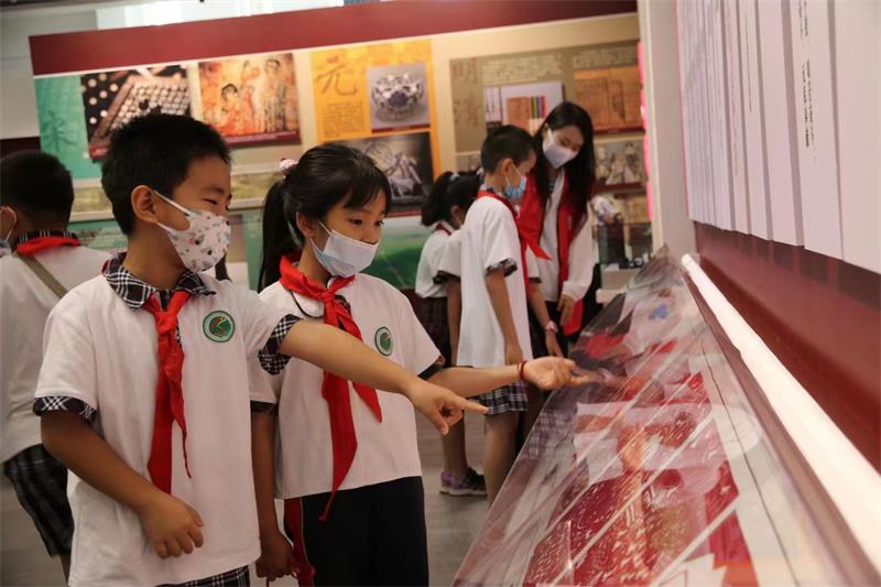 “中华人民共和国国旗的红色象征革命。五角星用黄色是为了在红地上显出光明,四颗小五角星各有一尖正对着大星的中心点,表示围绕着一个中心而团结。”在“我的祖国”板块中,同学们在老师的讲解下,进一步了解了国旗、国徽和国歌诞生的故事。一幅幅图片、一件件展品在孩子们心里留下了深深的印记。跟随老师的讲解,同学们在不同主题板块中仔细观看展品,积极互动体验,深切感受到了壮丽的祖国山河和璀璨的中华文化,以及伟大的民族精神所汇聚起的磅礴中国力量。