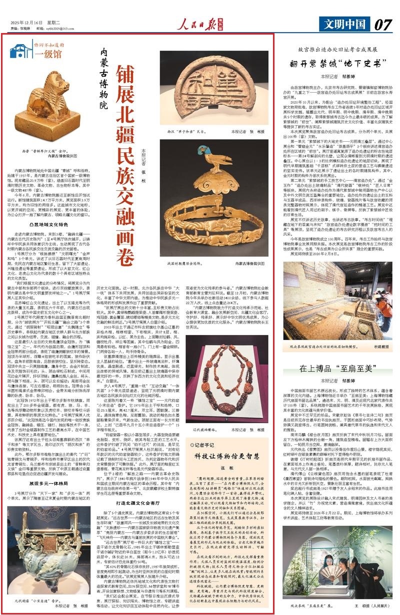 12月16日,《人民日报海外版》刊发《内蒙古博物院 铺展北疆民族交融画卷》,报道内蒙古自治区首个国家一级博物馆今年6月搬迁至新馆后开馆试运行。新馆建筑面积14.7万平方米,展览面积3.9万平方米,均为旧馆的两倍多。这座城市文化地标,以更开阔的空间、更精彩的展览、更丰富的体验,为公众打开一扇了解内蒙古、领略北疆文化的窗口。