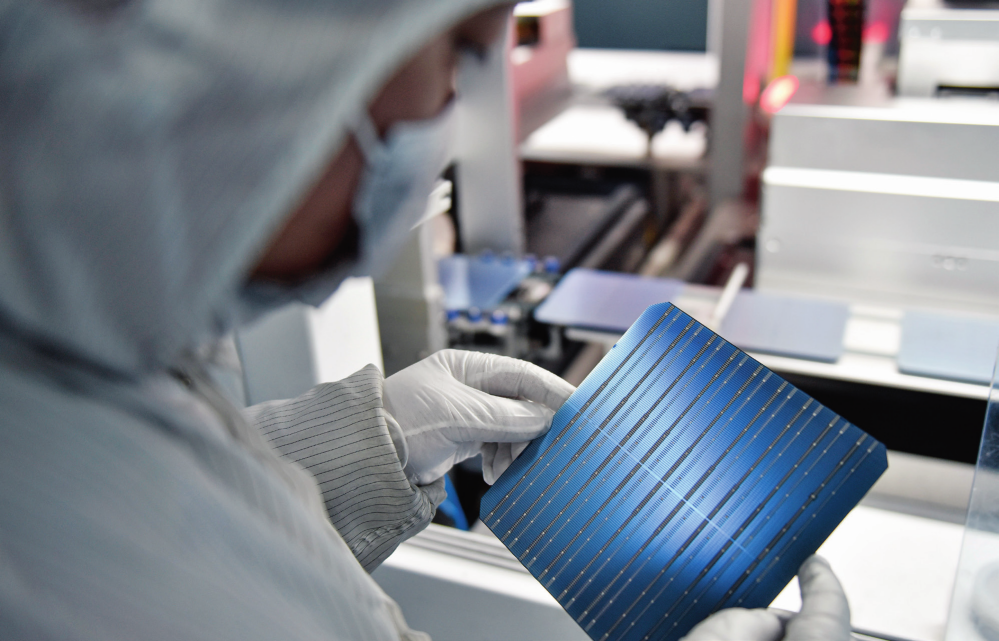 青海黄河上游水电开发有限责任公司西宁太阳能电力分公司车间,一名工作人员在检查光伏组件(2023年2月22日摄)吴刚摄/本刊
