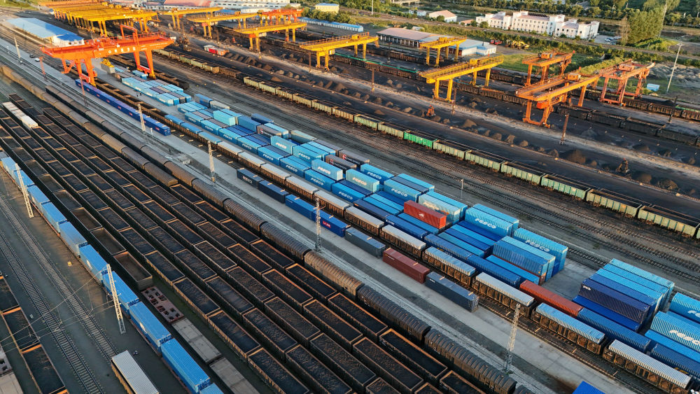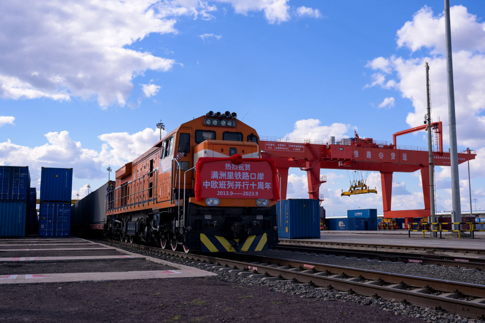 2023年9月20日,一列中欧班列行驶在内蒙古满洲里站货运车间集装箱场。作为我国向北开放的“桥头堡”、中欧班列“东通道”的重要口岸,满洲里铁路口岸不断加大中欧班列通道能力建设,进一步提升运输效率和品质。