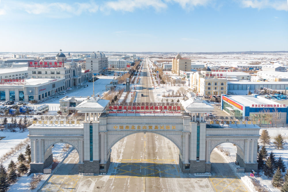这是2024年1月31日拍摄的中国(黑龙江)自由贸易试验区黑河片区(无人机照片)。五年来,中国(黑龙江)自由贸易试验区将“试验田”种成“高产田”,以全省万分之三的面积,贡献了全省约五分之一的实际使用外资和七分之一的外贸进出口,在对外合作、降低物流成本、培育特色产业和新业态新模式等方面深入探索,成功产出超过300项制度创新成果。