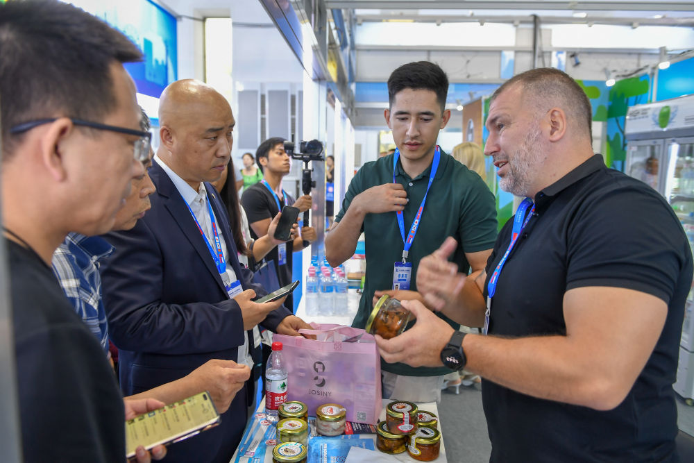 2023年8月23日,在第十四届中国—东北亚博览会东北亚商品馆,俄罗斯参展商向参观者介绍商品。