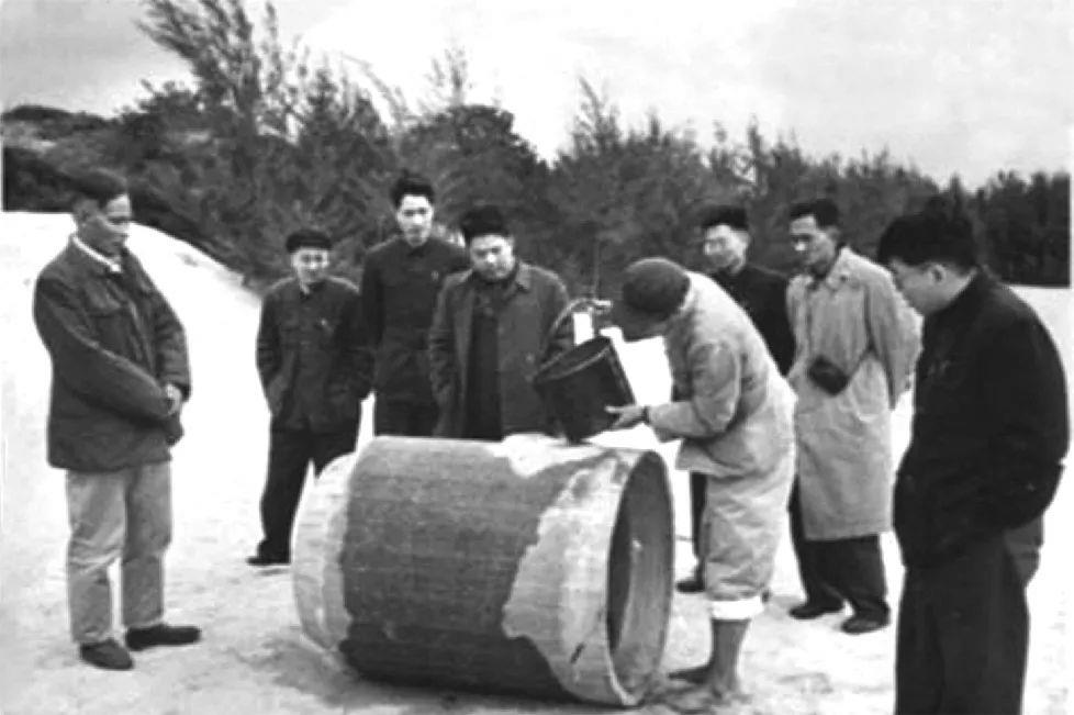 △ 谷文昌在湖尾地下水工地与工程技术人员一起试验滤水管。