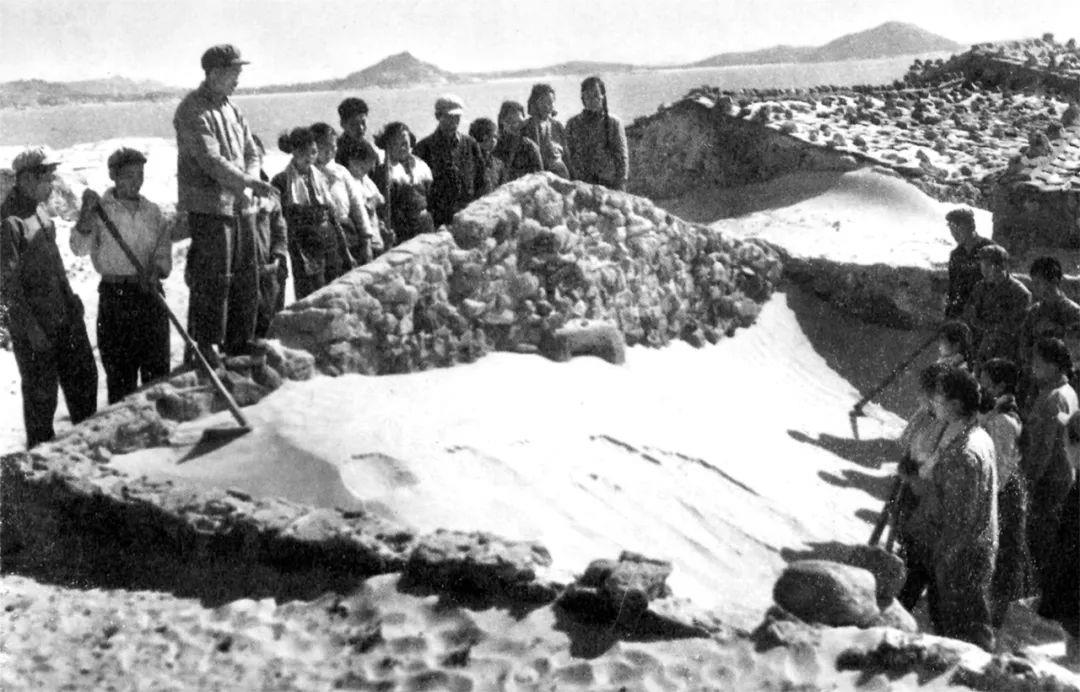 △ 谷文昌在山口村察看风沙灾情,与当地群众一起探讨治沙良策。