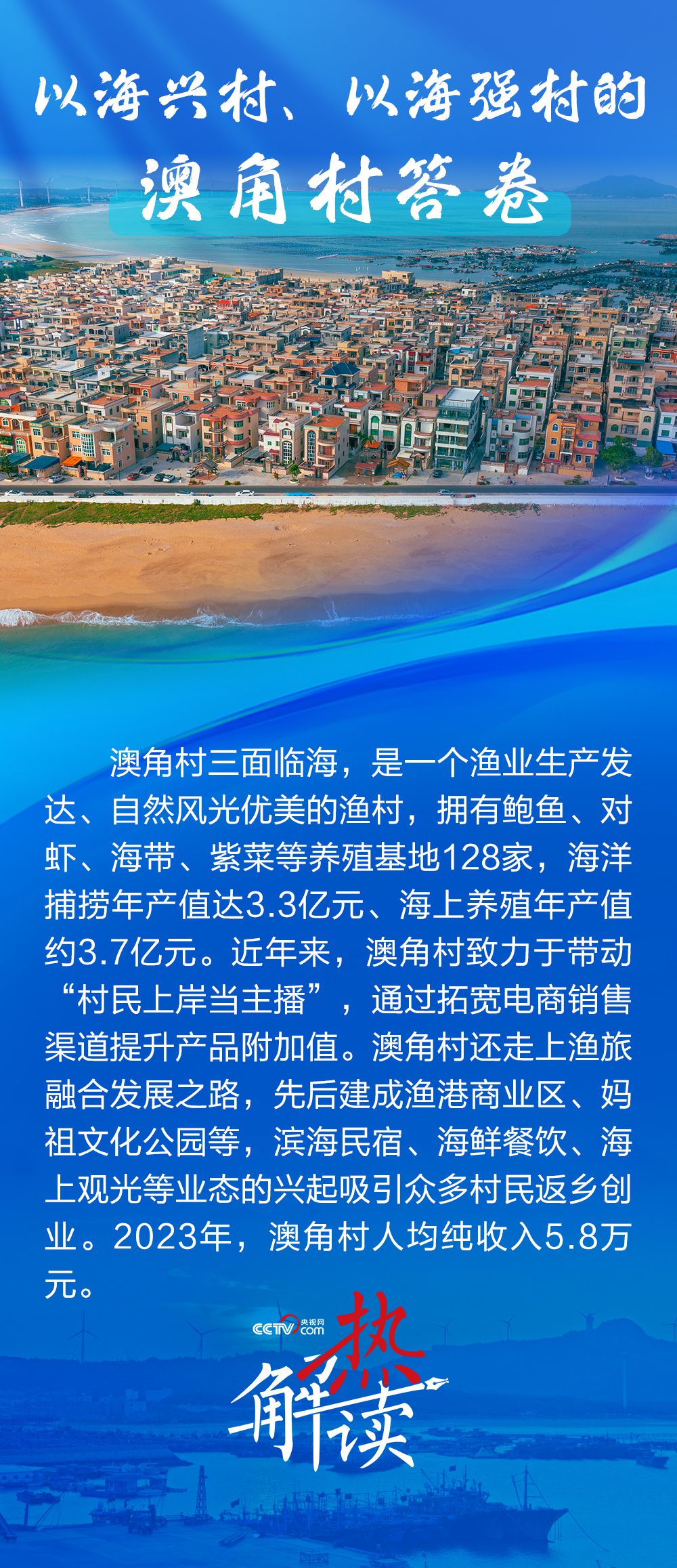 澳角村三面临海,近年来走出了一条以海兴村、以海强村的新路子。看到乡村发生了巨变,总书记直言“乡村振兴还是要发扬优势”,并勉励澳角村做好“海”的文章,在乡村振兴、共同富裕的道路上一往无前。