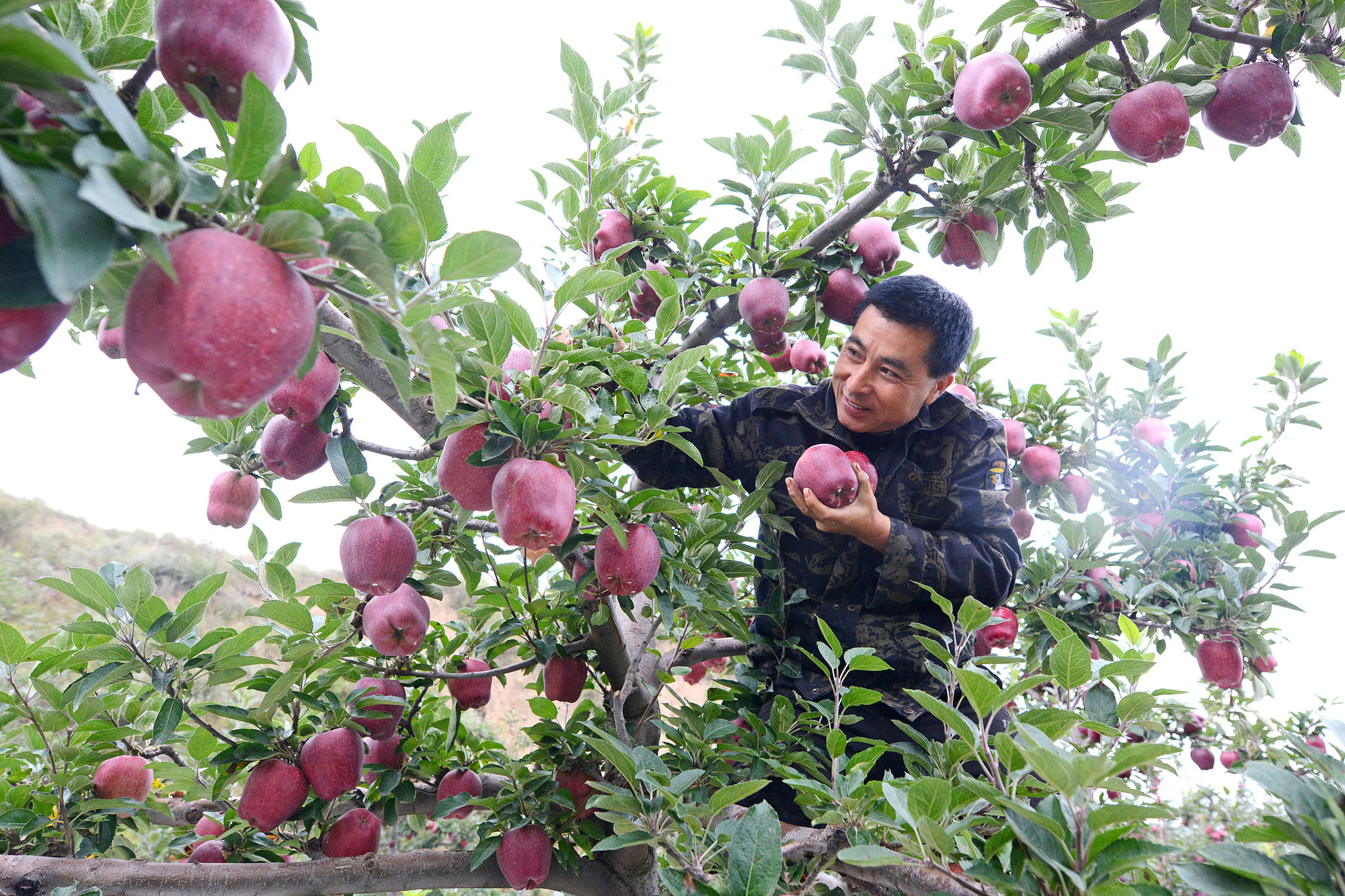 (果农在采摘花牛苹果)