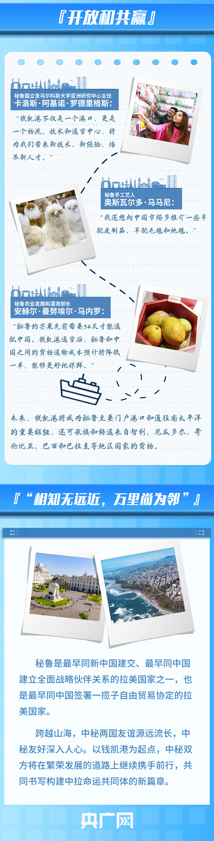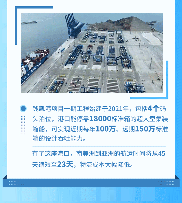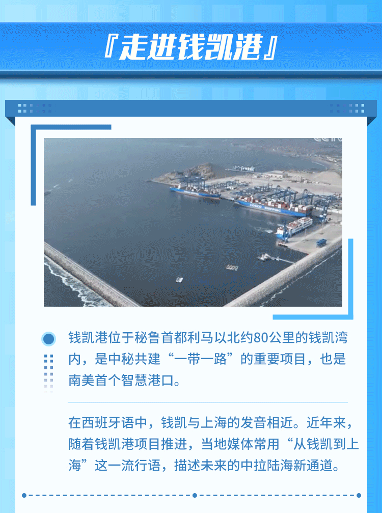 钱凯港位于秘鲁首都利马以北80公里,是中秘共建“一带一路”重点项目。开港后,中秘间单程海运时间将缩短至23天,节约20%以上的物流成本,每年将为秘鲁创造逾8000个直接就业机会。