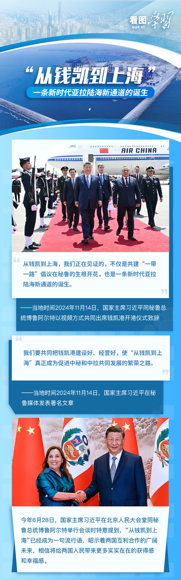“开港!”当地时间11月14日,国家主席习近平同秘鲁总统博鲁阿尔特以视频方式共同出席钱凯港开港仪式。习主席在致辞中祝贺钱凯港顺利开港,对两国建设者克服疫情困难、齐心协力、保质保量完成各项任务致以敬意,强调“我们要共同努力,一道把钱凯港建设好、管理好、运营好,不断提升运能运力、提高综合服务水平。”