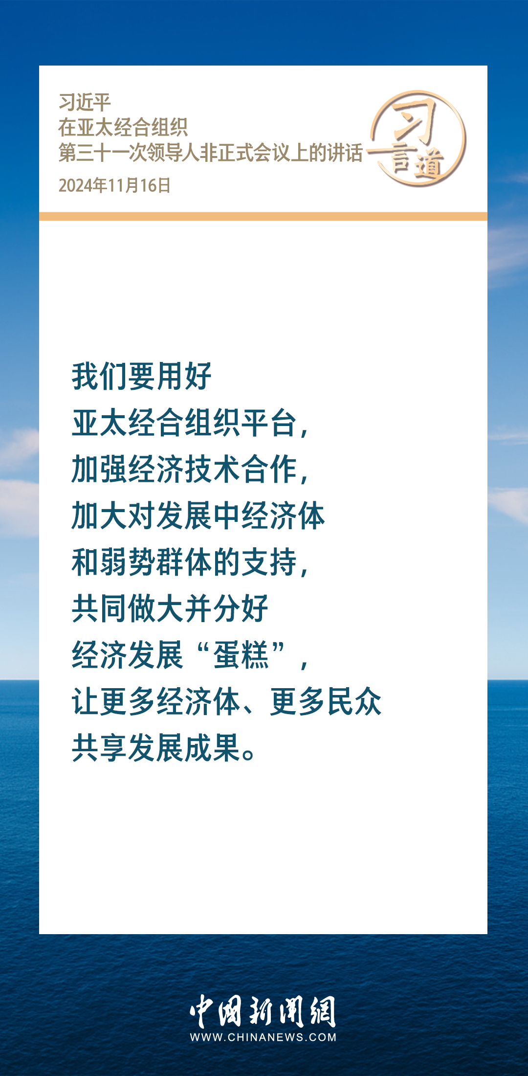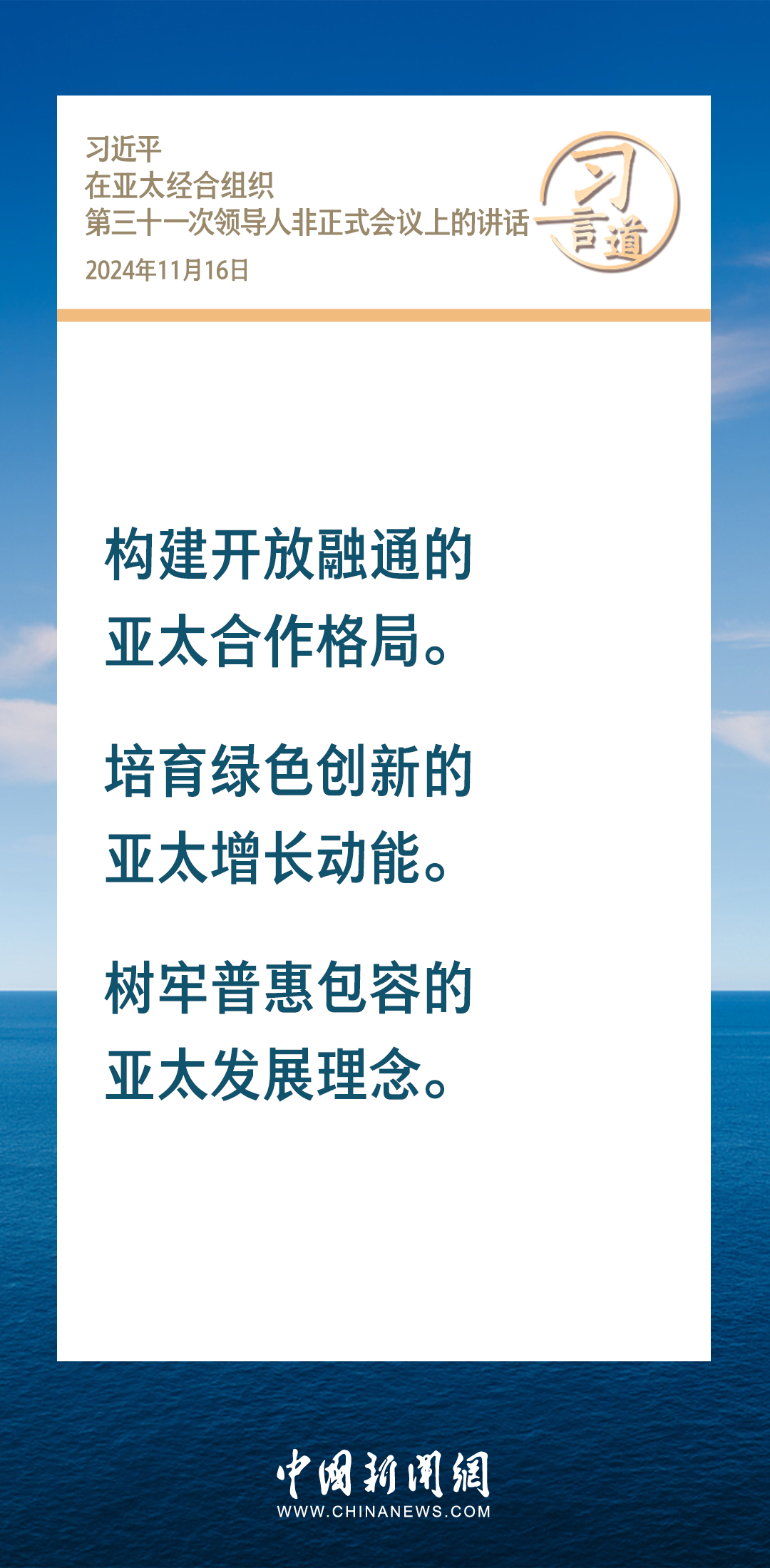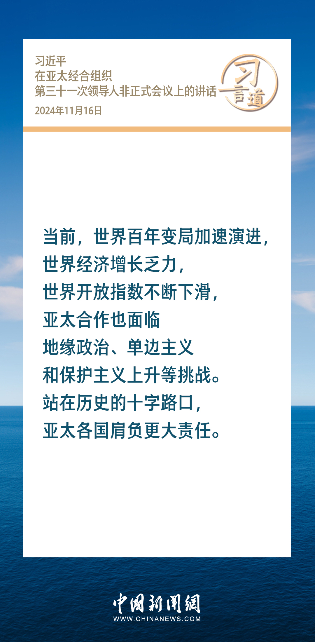 当地时间11月16日,国家主席习近平出席亚太经合组织第三十一次领导人非正式会议并发表重要讲话。习近平指出——