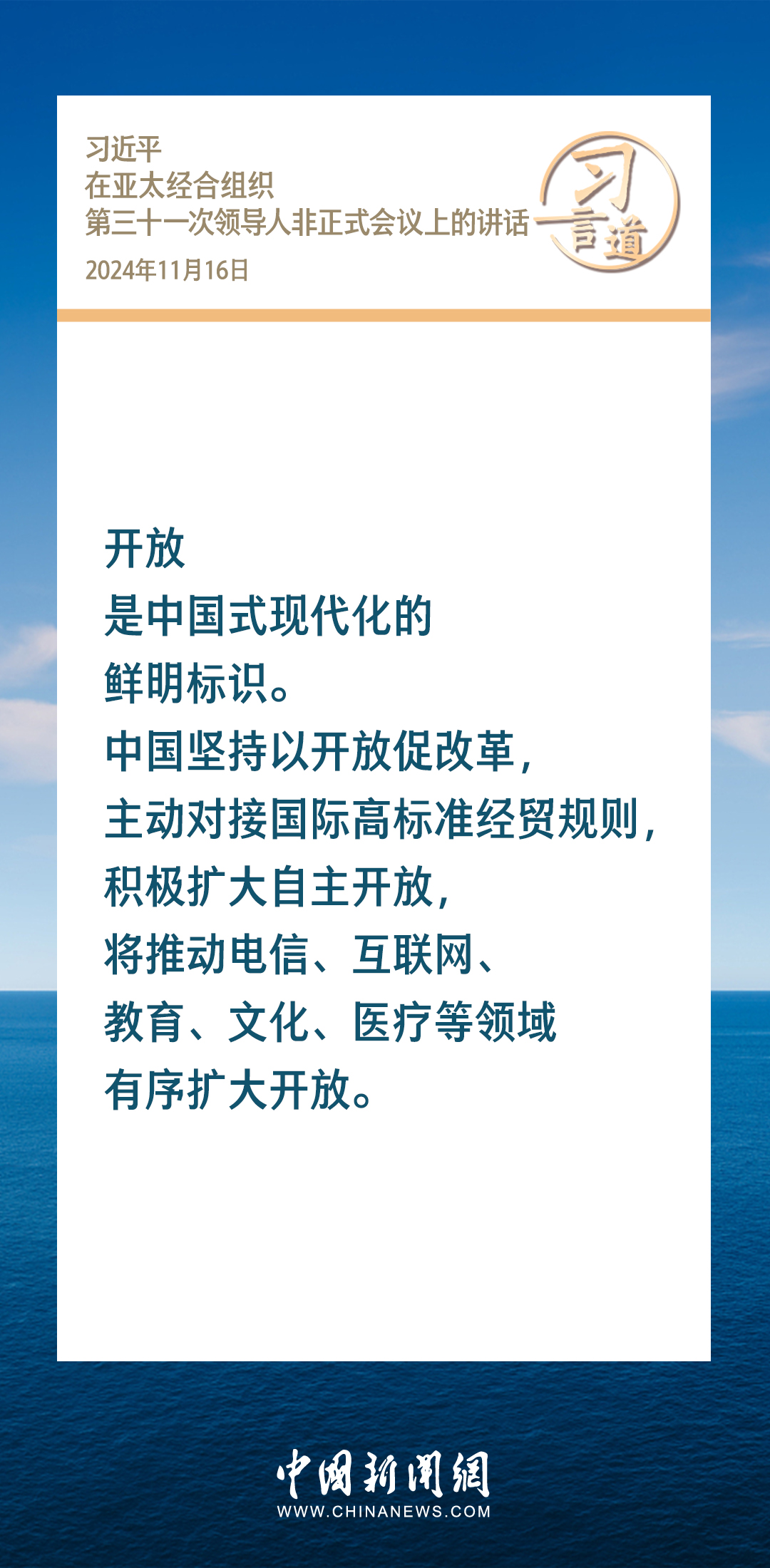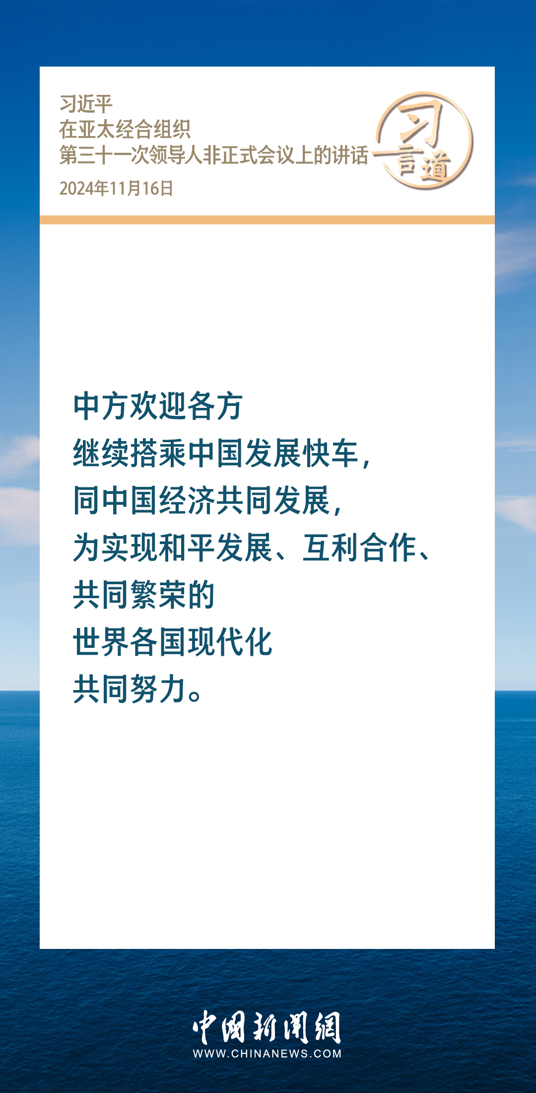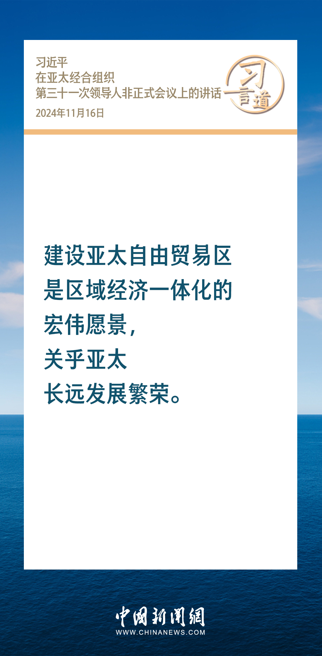 当地时间11月16日,国家主席习近平出席亚太经合组织第三十一次领导人非正式会议并发表重要讲话。习近平指出——