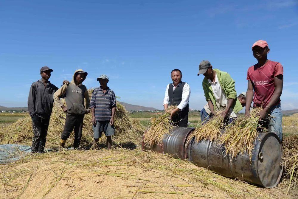 △在马达加斯加,中国杂交水稻技术专家和当地农民一起收获水稻。