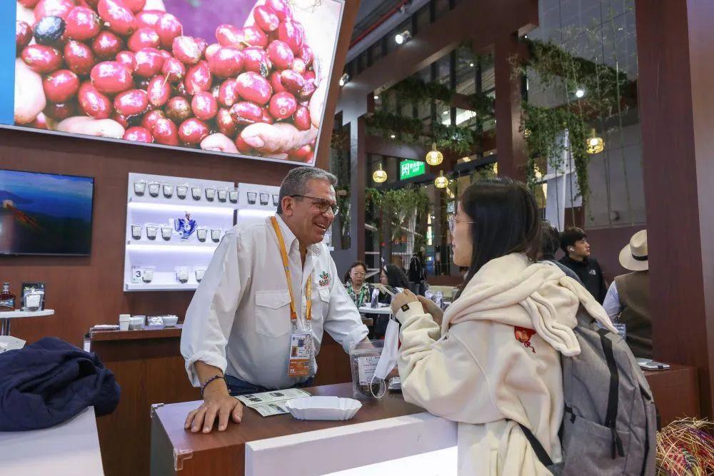 △2024年11月5日,第七届进博会国家展尼加拉瓜馆的工作人员向观众介绍商品。