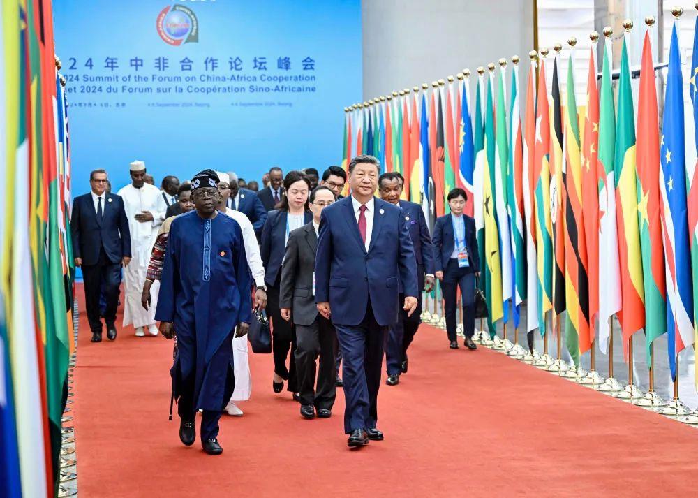 △2024年9月5日,中非合作论坛北京峰会开幕式,习近平主席同外方领导人共同步入会场。
