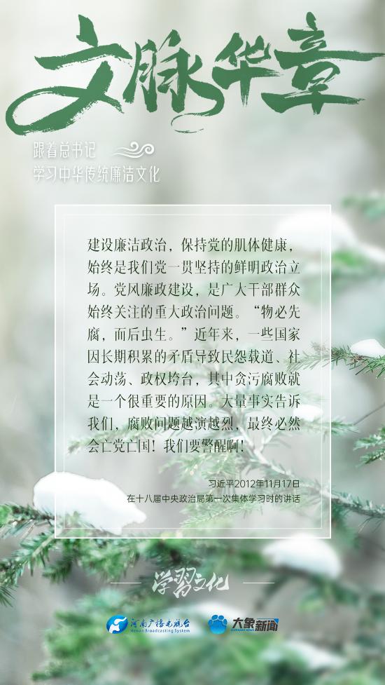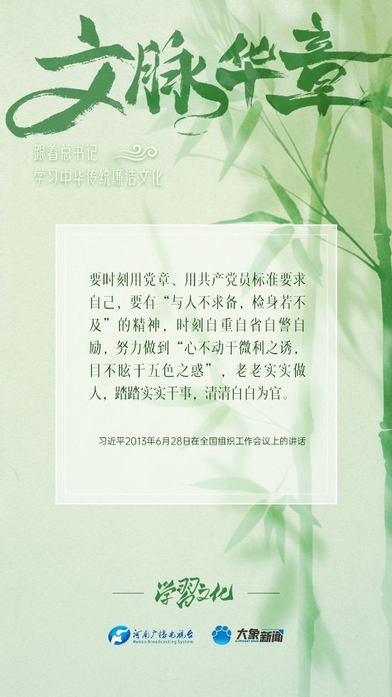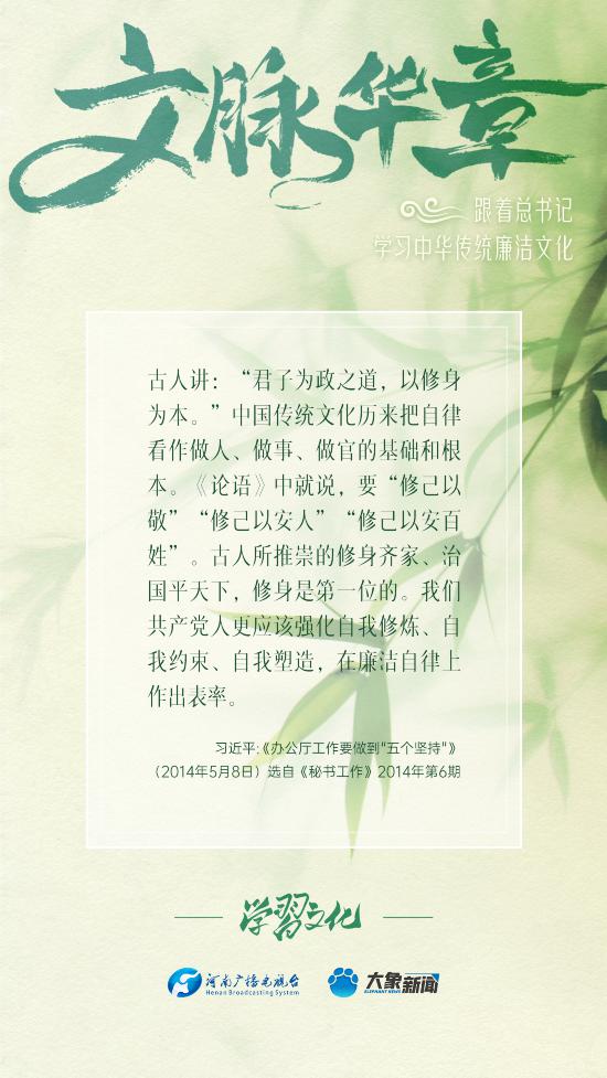 中华优秀传统文化蕴含着丰富的廉洁文化,习近平总书记曾指出:没有中华优秀传统文化、革命文化、社会主义先进文化的底蕴和滋养,信仰信念就难以深沉而执着。总书记常常引经据典,教育引导广大党员干部正心修身,涵养文化,守住为政之本。大象新闻分五期为您梳理,我们一起跟着总书记学习中华传统廉洁文化。今天推出第五期。