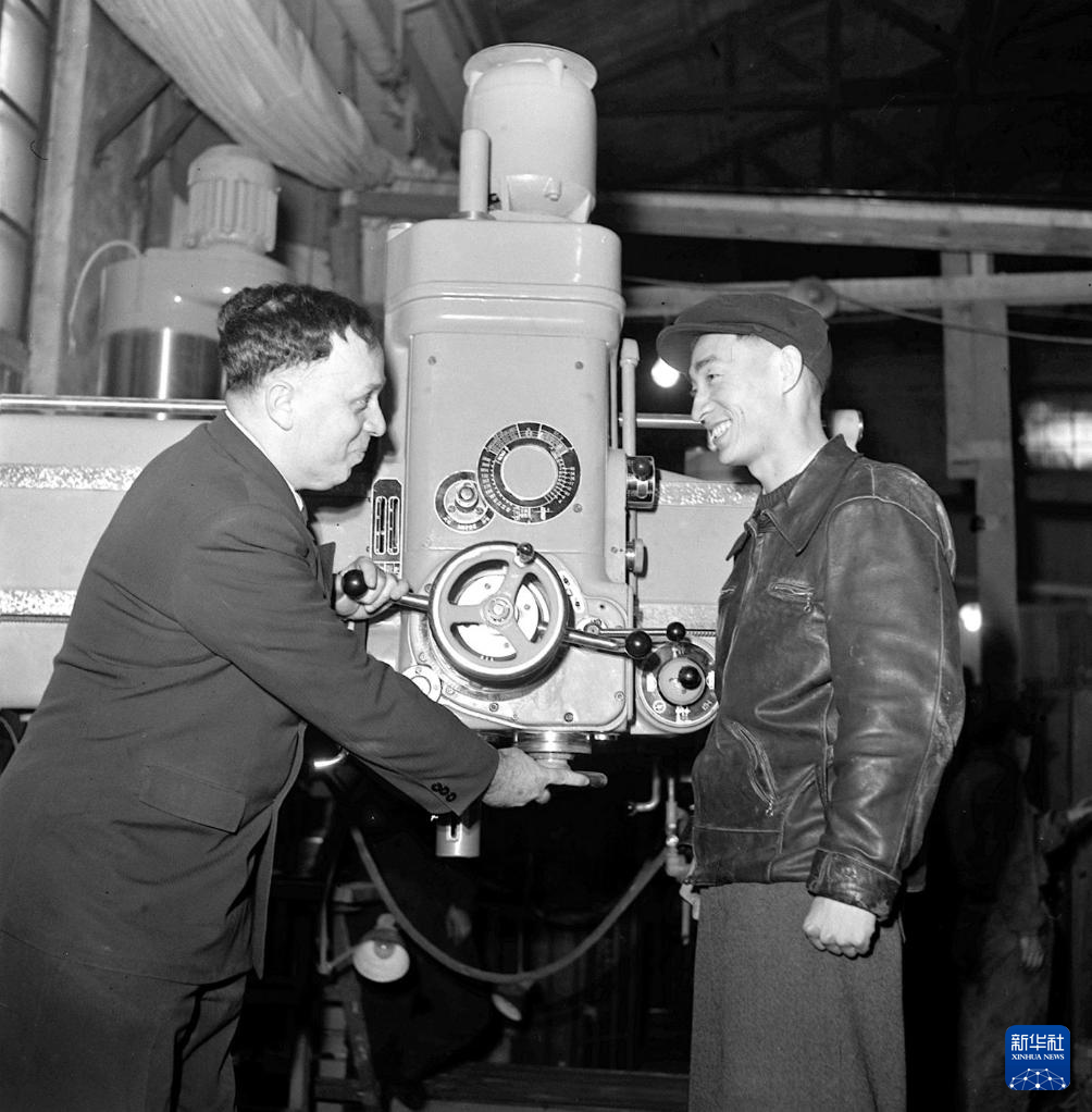 1956年,邹家华同志在沈阳和苏联专家检查生产出来的摇臂钻。