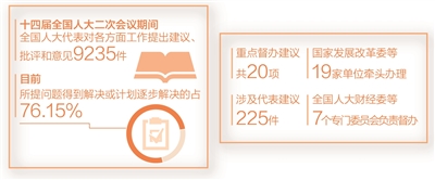 据全国人大常委会代表工委负责人介绍,十四届全国人大二次会议期间,全国人大代表依法履职尽责,对各方面工作提出建议、批评和意见9235件,交由213家承办单位研究办理,其中,重点督办建议共20项。
