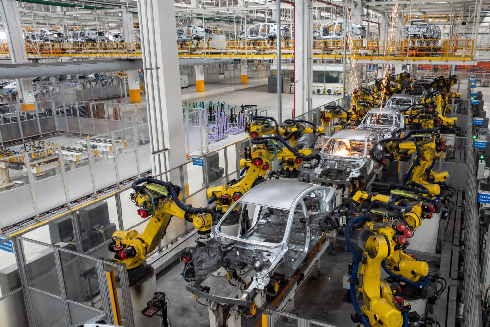 这是2024年3月21日在比亚迪长沙雨花工厂拍摄的自动化生产线。2024年中国新能源汽车产量突破1300万辆,人工智能、数字经济等领域创新成果持续涌现,处处都能看到民营企业大显身手。
