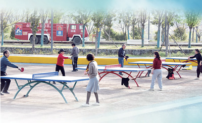 湖北省十堰市,市民在体育运动公园里打乒乓球。
