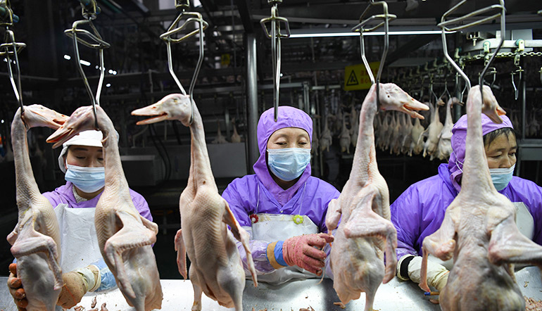 4月18日,工人在九牧合农牧科技有限公司肉鸭生产线上作业。