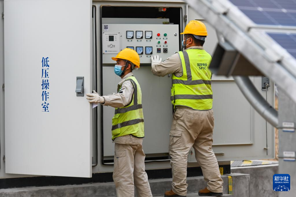 在几十公里外的达拉特旗光伏发电应用领跑基地,一块块光伏板连成一片,墨蓝色的“光伏长城”闪闪发光。