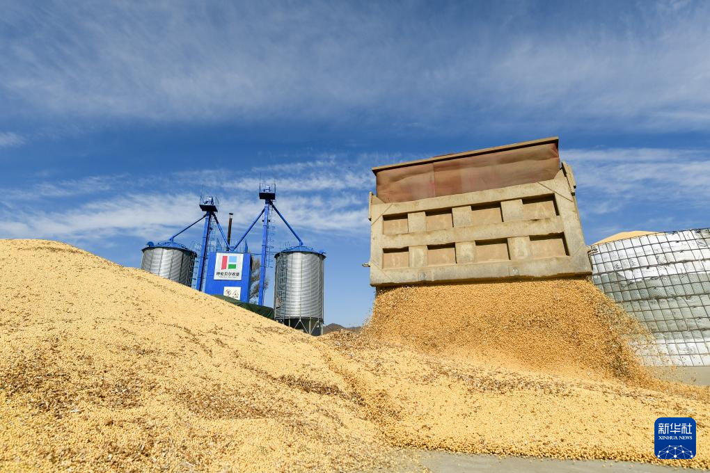 走进扎兰屯的田野,金黄饱满的玉米见证着这片土地的丰收。眼下,一派繁忙的秋粮收购景象正在上演。在呼伦贝尔东北阜丰生物科技有限公司,上百辆载满玉米的车辆排起长龙,检验、过磅、卸粮等环节有序进行。今年,该公司的玉米收购价格为每斤0.98元,并开辟绿色通道,优先收购困难农户的玉米。 2022年9月28日,在位于扎兰屯市的呼伦贝尔农垦绰尔河农牧场,工作人员将收获的大豆卸入晾晒区。新华社记者 贝赫 摄