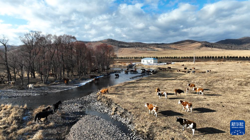 作为呼伦贝尔市玉米主产区的扎兰屯,在阜丰公司带动下,玉米种植已成为当地农业“当家”产业。目前,阜丰公司年精深加工玉米能力达到220万吨,带动扎兰屯市及周边地区近600万亩玉米实现就地加工转化。今年1月至9月,公司实现工业总产值82亿元,其中出口创汇2.36亿美元,产品销往70多个国家和地区。 这是2024年11月11日在内蒙古呼伦贝尔市扎兰屯市柴河镇拍摄的牧群(无人机照片)。新华社记者 贝赫 摄