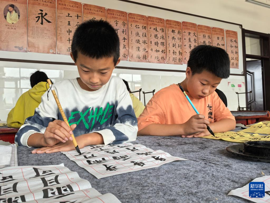 在卧牛河镇中心校,走廊的墙上挂满了学生的书法、美术作品。在书法教室里,一位退休教师正耐心指导孩子们练习书法。他弯着腰,从每个孩子身边走过,时而停下来纠正孩子们的握笔姿势,时而提醒字的结构要点。教室里弥漫着墨香,孩子们安静专注,一笔一划在宣纸上书写。 2024年12月6日,学生在卧牛河镇中心校上书法课。新华社发(周浩摄)