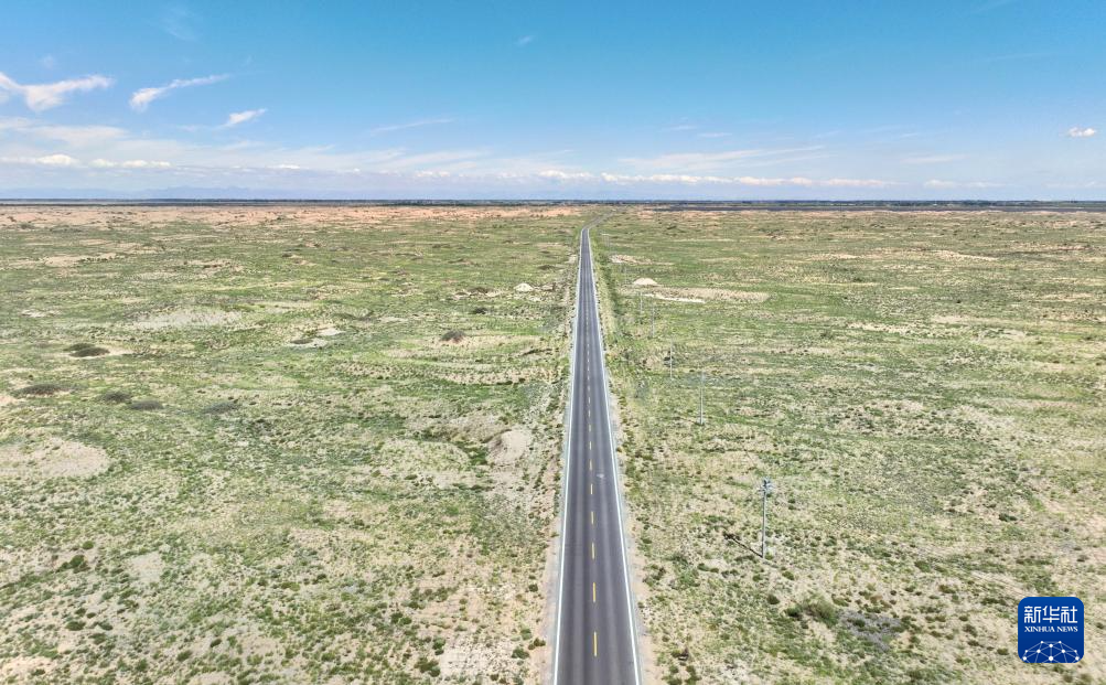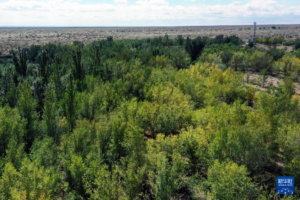 记者沿途发现,曾经肆虐多年的乌兰布和沙漠东缘流沙已被成片的酸枣、梭梭、花棒和红柳等牢牢锁住,沙丘间新栽的树苗迎风挺立,在连绵起伏的沙丘上铺展出一层层绿色的涟漪。远处,光伏板如同蓝色的波浪向沙漠腹地绵延,板下是顽强生长的绿色植被。巴彦淖尔市林草局治沙造林科科长焦慧亮说:“现在,全市一条南北长200公里、东西平均宽1.2公里的绿色屏障全线贯通,将乌兰布和沙漠牢牢锁在西侧,守护着黄河和河套平原的生态安全。”